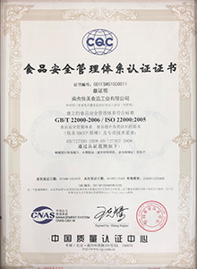 公司于2008年按ISO 9000標(biāo)準(zhǔn)建立質(zhì)量管理體系,同時(shí)取得ISO 9001質(zhì)量體系認(rèn)證證書(shū)、HACCP 體系認(rèn)證證書(shū),并于2018年取得ISO 9001:2015質(zhì)量體系認(rèn)證證書(shū)。公司于2014年按ISO 22000標(biāo)準(zhǔn)建立食品安全管理體系,同時(shí)取得ISO 22000食品安全管理體系認(rèn)證證書(shū)。南充佳美不斷提升與進(jìn)取,于2018年取得了FSSC 22000食品安全體系認(rèn)證證書(shū)。
